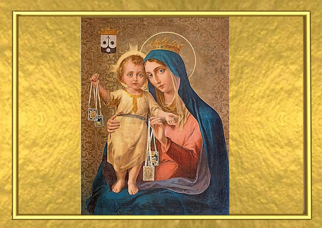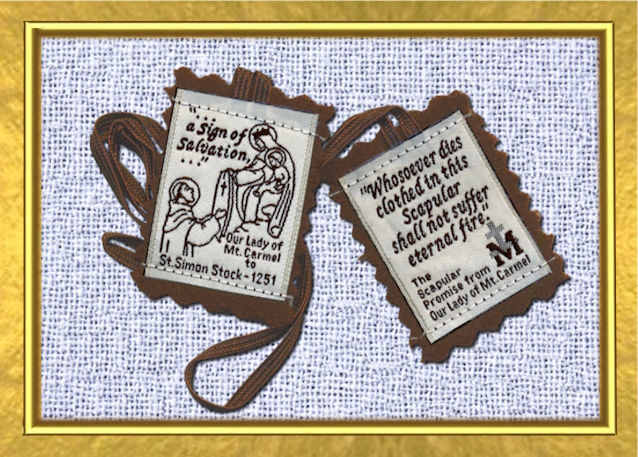 Ordem dos Carmelitas por volta de 1251, na cidade de Aylesford, Inglaterra, Nossa Senhora apareceu a São Simão Stock, um carmelita e lhe entregou um escapulário de lã marrom e disse: " Este será um privilégio para você e todos os carmelitas, que qualquer um morrendo neste hábito não sofrerá o fogo eterno. "