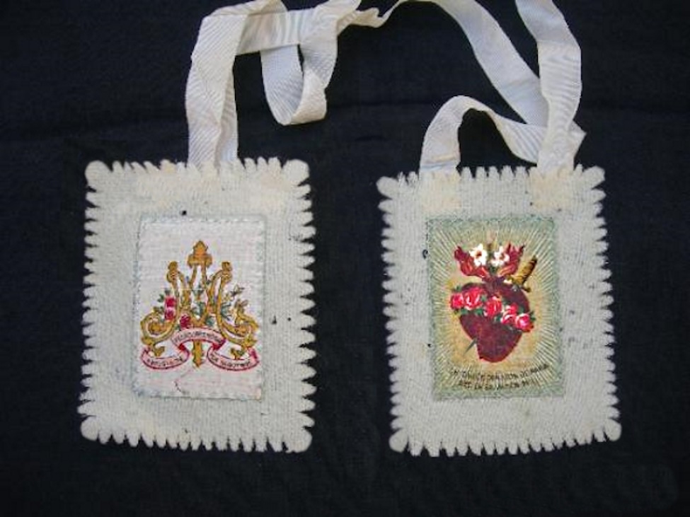 Escapulário Branco é originado da Congregação dos Missionários – Filhos do Imaculado Coração de Maria, fundada por São Antônio Clarete em 1849. Foi aprovado pelo Papa Pio IX em 1877. De um tecido de cor branca, na frente com imagem do coração de Maria ardendo como chamas de fogo, no qual cresce um lírio e rodeando o coração uma coroa de rosas, perfurado por uma espada. No reservo um sinal de uma cruz ou uma imagem da Mae da Misericórdia.