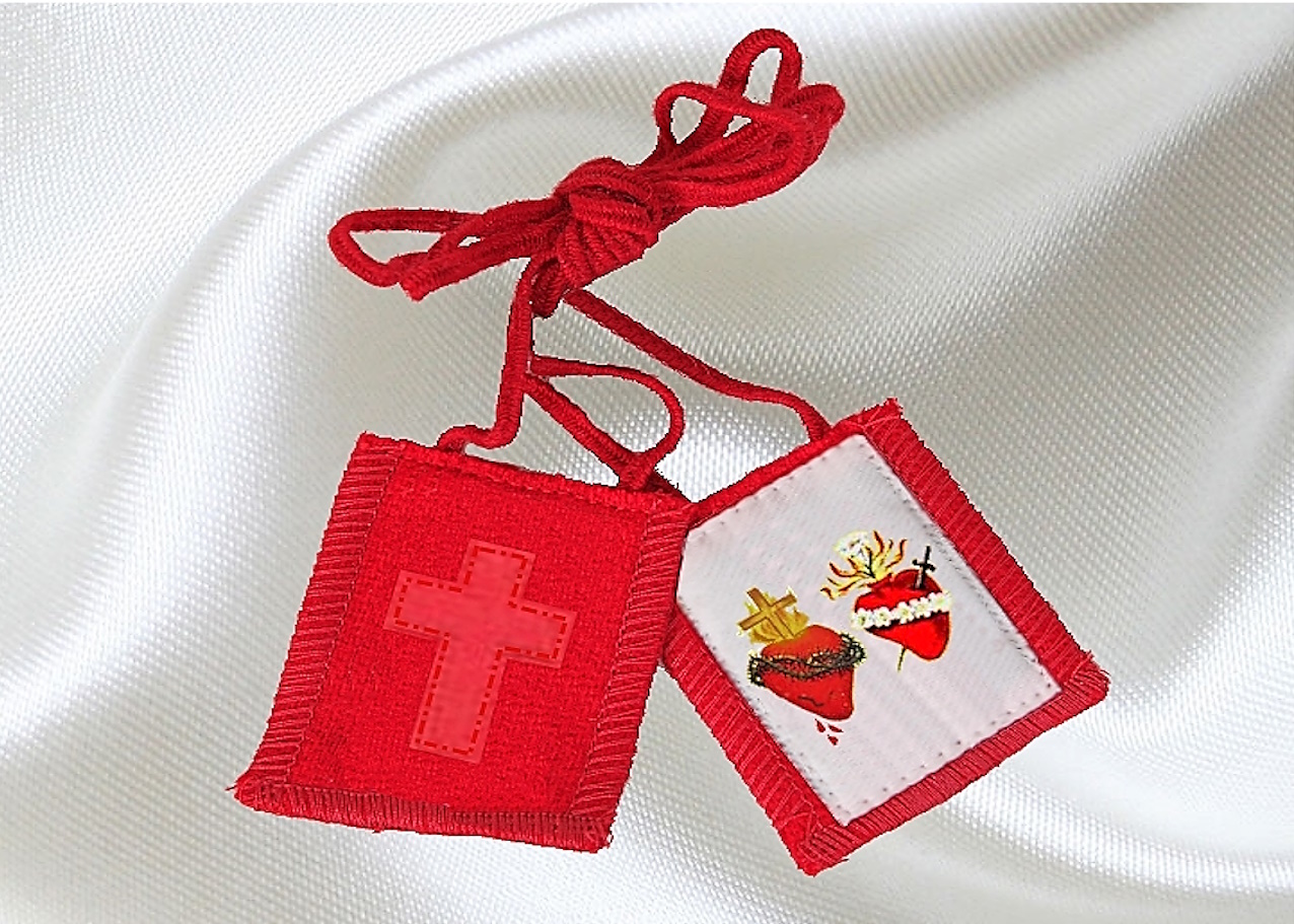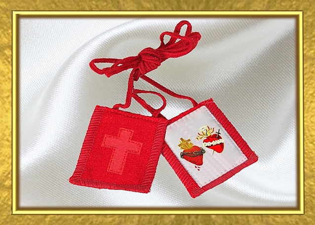 Vem da Congregação da Filhas do Sagrado Coração, fundada na Antuérpia em 1873. Aprovado pelo Arcebispo de Marselha em 1900. Na frente imagem do Sagrado Coração de Jesus e Imaculado Coração de Maria transpassado por uma espada e a outra peça é de cor vermelha com uma pequena Cruz. Escapulário de cor Vermelho.