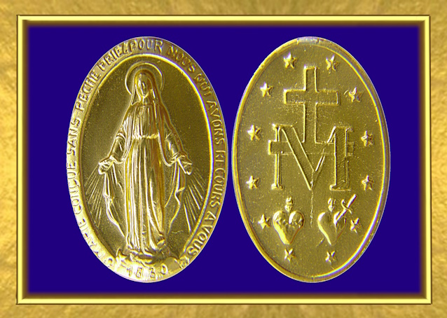 uma visão onde Nossa Senhora aparecia em um circulo oval com a inscrição